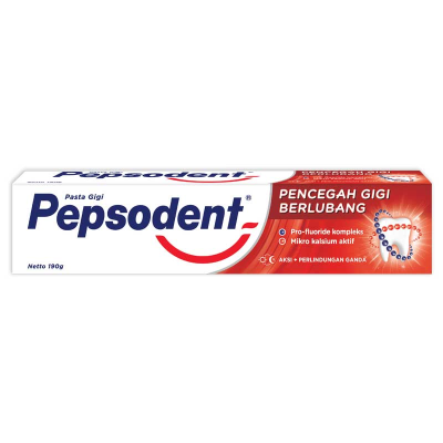 Pepsodent Pencegah Gigi Berlubang Pasta Gigi 190 g dapat memberikan perlindungan selama 12 jam untuk mencegah adanya gigi berlubang. Hal ini dapat dilakukan dengan mengembalikan mineral gigi yang hilang dan menghasilkan lubang kecil yang tak kasat mata. Pasta gigi Pepsodent memiliki perlindungan Mikro Kalsium Aktif membantu memperbaiki* lubang kecil tak kasat mata, dan Pro-Fluoride Kompleks melindungi gigi lebih lama. Jadi, gunakanlah Pepsodent Pencegah Gigi Berlubang Pasta Gigi 190g dan jauhkan dirimu dari permasalahan gigi berlubang.